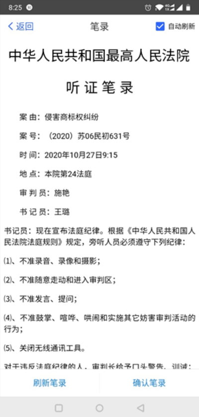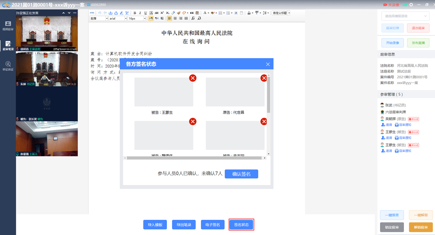 • 点击“庭审笔录”当事人可以同步查看庭审笔录内容,点击确认笔录按钮即可进行签名操作,如下图: