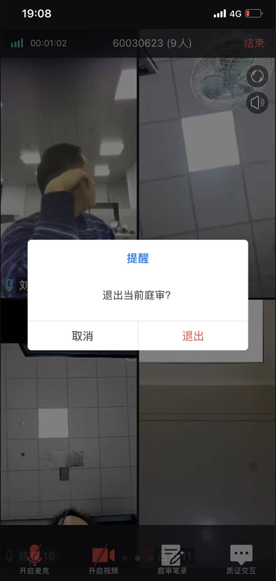 • 点击“退出”可以结束庭审,请在法官允许情况下退出庭审,如下图: