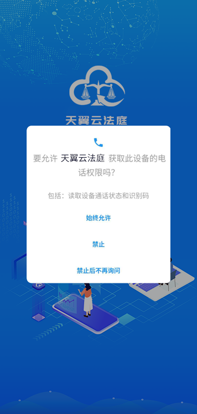 一、每次运行时,会进行终端自检,APP请求的手机应用权限均需同意。如图1-4所示,所有自检通过后,才能保障庭审正常。重要提示:请在法院通知的开庭时间前提前十分钟打开手机APP自检登录,如自检有问题请更换设备参加庭审。 请使用书记员告知的帐号(手机号)和密码(请询问审判人员或管理员获取密码)登录天翼云法庭庭审系统,如下图: