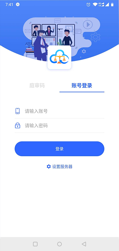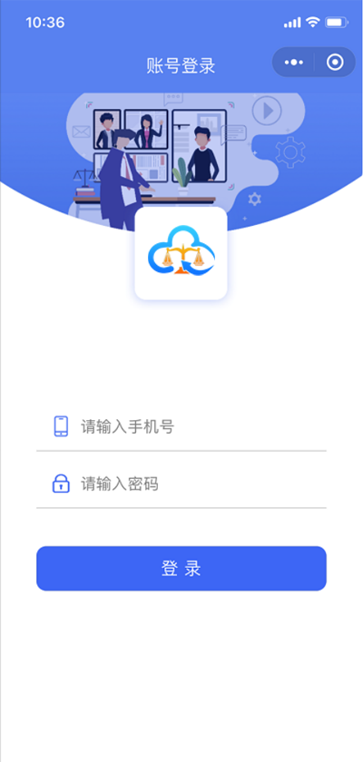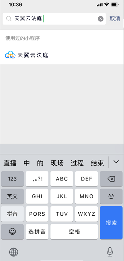 在微信小程序中搜索:天翼云法庭庭审。点击天翼云法庭庭审小程序。进入天翼云法庭庭审登录界面,如下图: