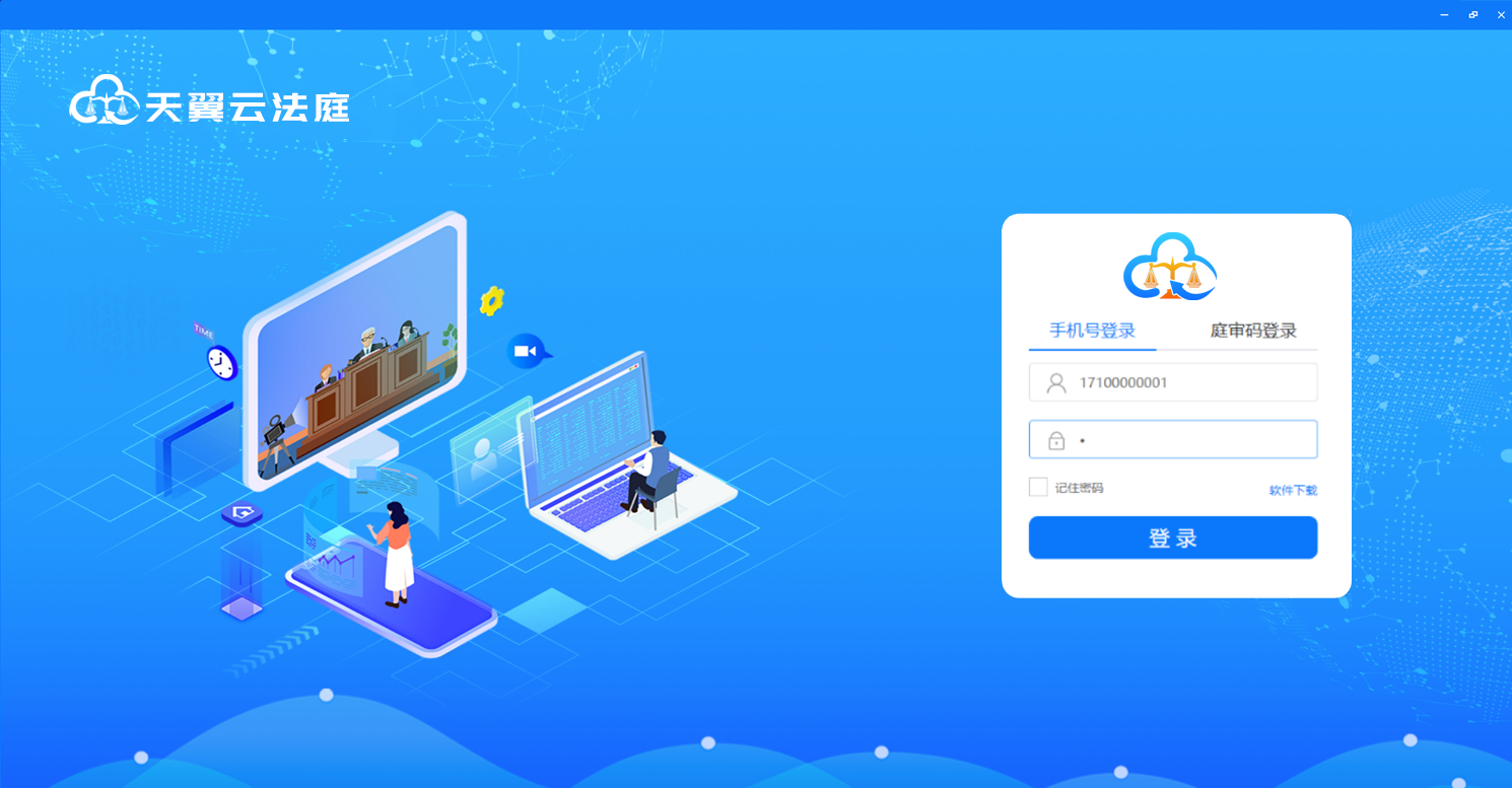 二、请使用书记员告知的帐号(手机号)和密码(请询问审判人员或管理员获取密码)登录天翼云法庭庭审系统,请当事人在法院通知的开庭时间前十分钟登录,等待开庭,如下图: