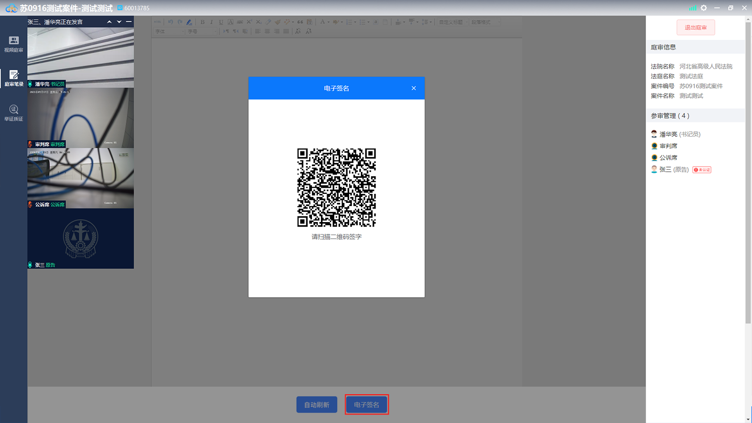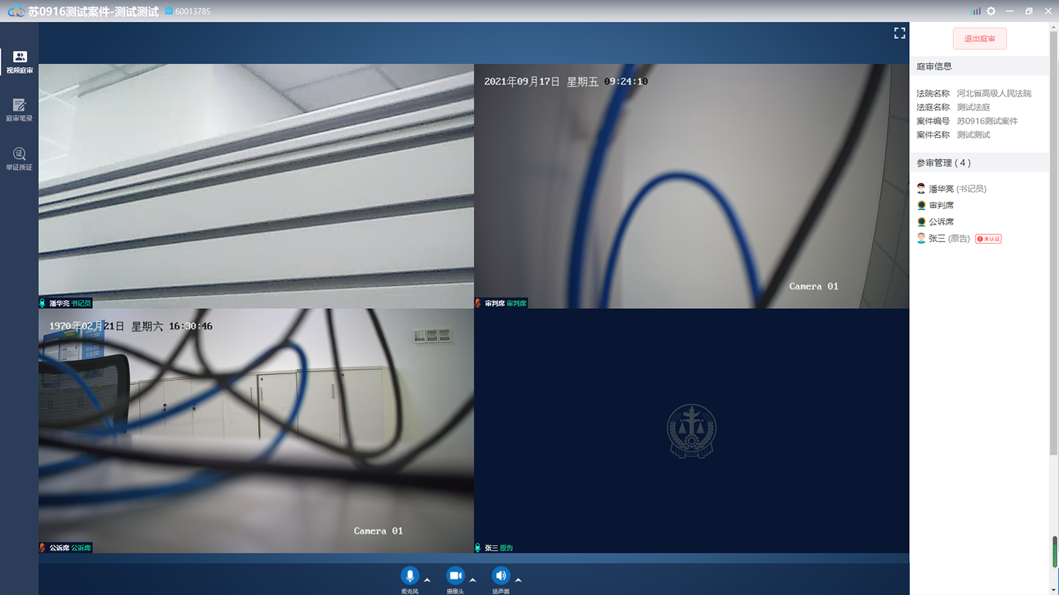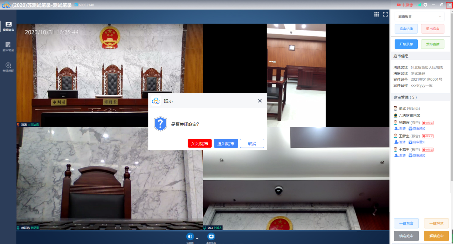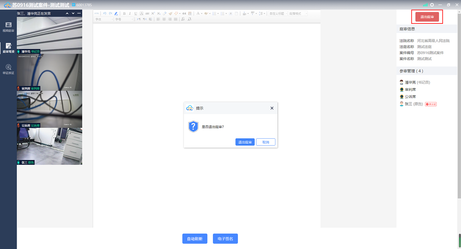 法官宣布庭审结束后,点击“退出庭审”按钮即可退出该次庭审,如下图: