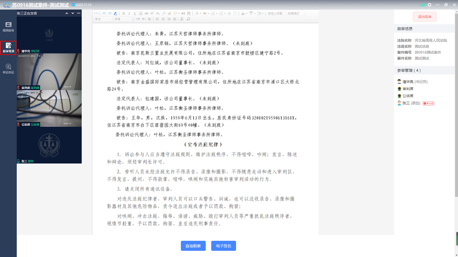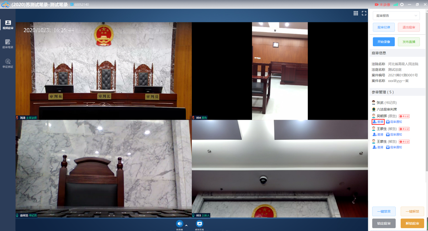 开庭操作由书记员完成,法官客户端会自动加入庭审,如下图: