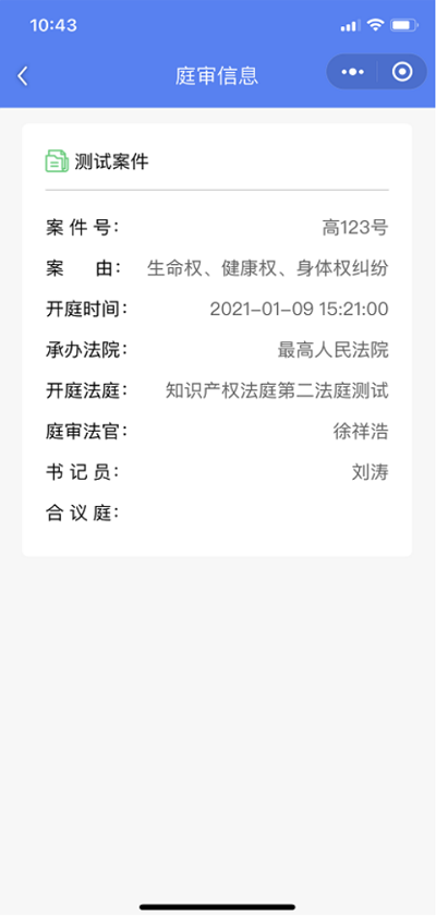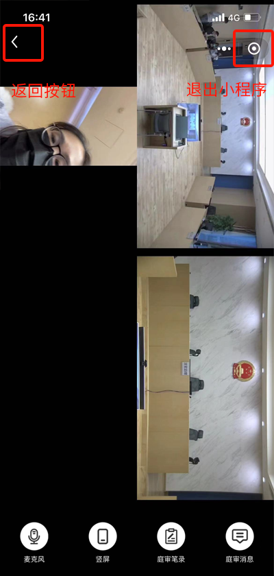 点击返回按钮或者退出小程序即可 退出庭审,如下图:
