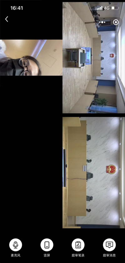 二、进入庭审,将手机横屏通过重力感应,可以自动横屏显示(如不能横屏,请打开手机自动旋转功能)。为保证音视频效果,建议以横屏模式参加庭审。注:默认四画面显示,五画面及以上,画面请向左滑动屏幕查看,如下图: