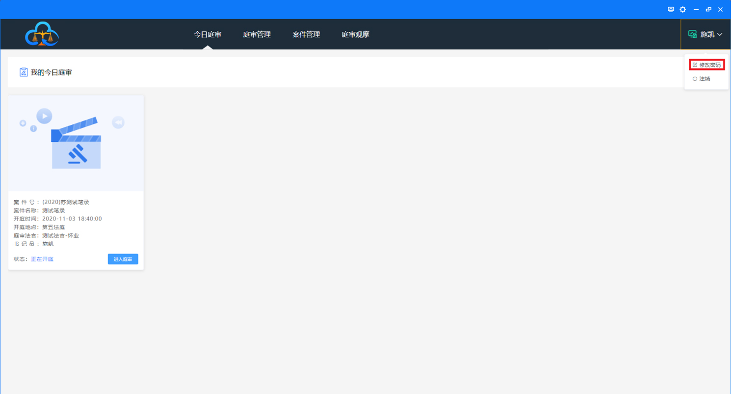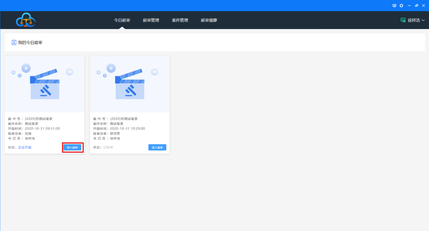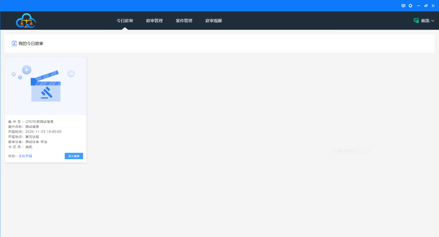 登录系统后,“今日庭审”仅显示该用户当天的庭审,如下图: