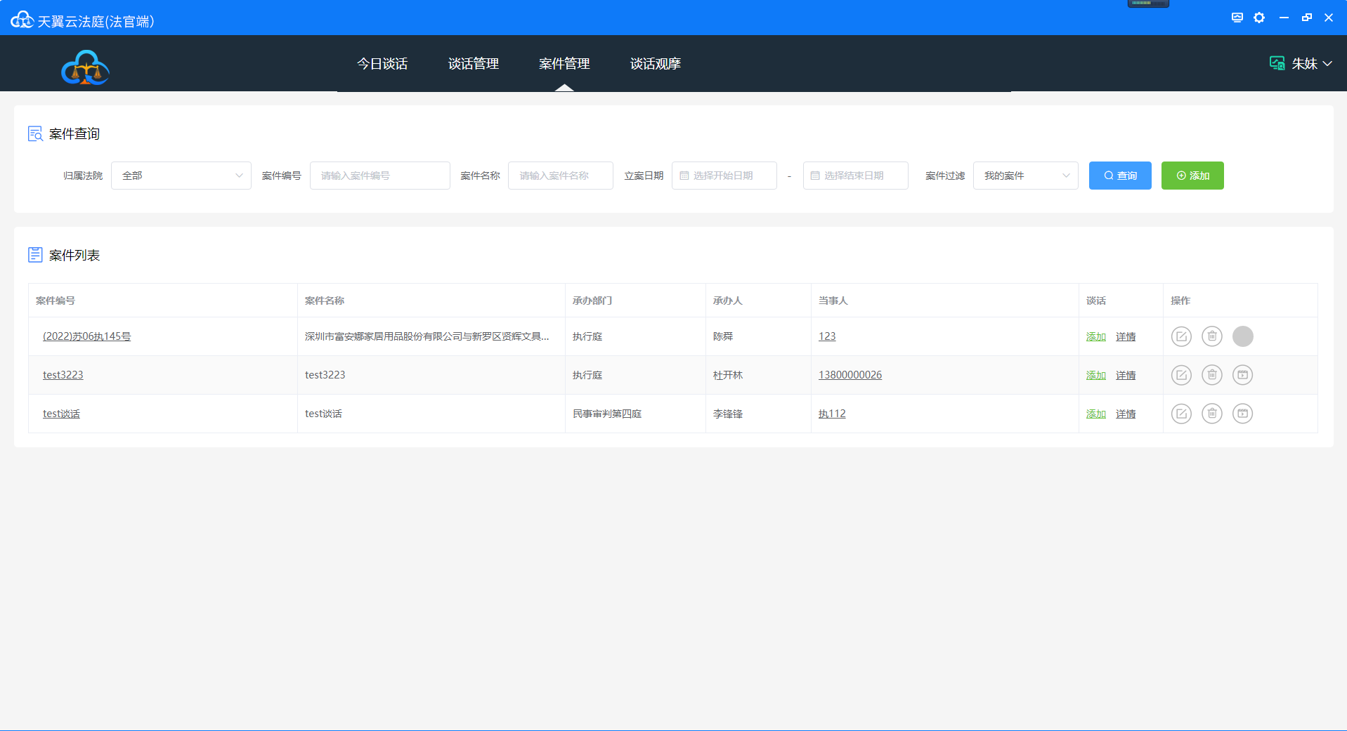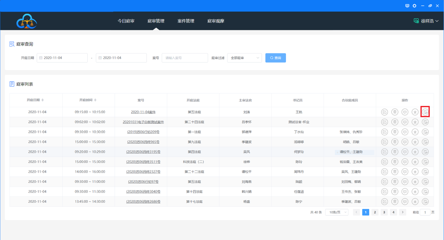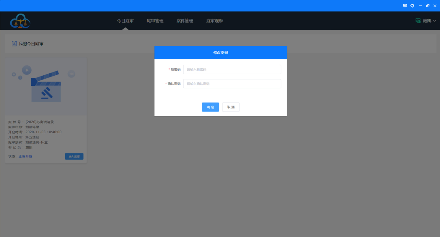 登录系统后,“今日庭审”仅显示该用户当天的庭审,如下图: