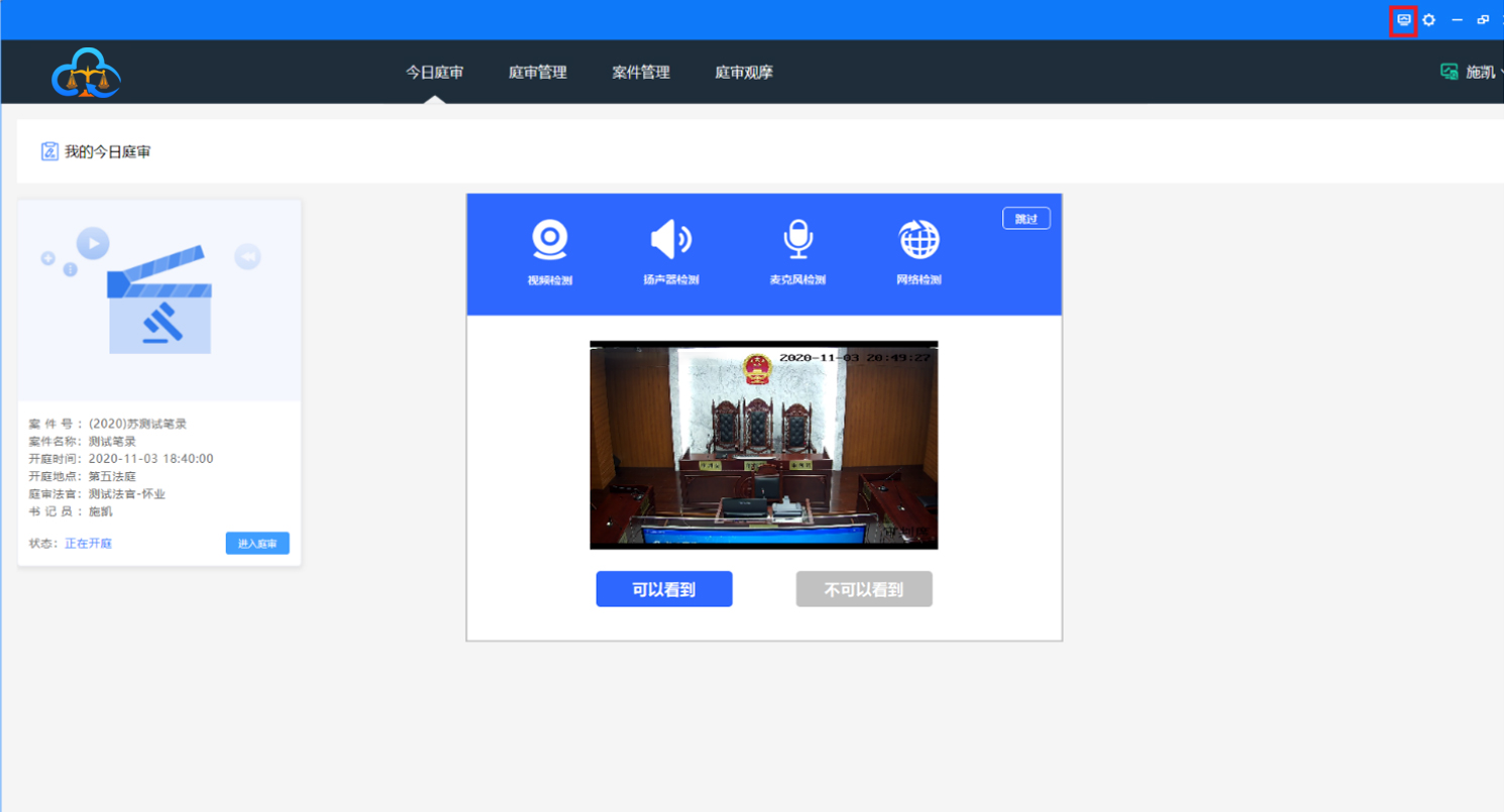 请按操作提示,进行相关确认。看得到法庭内视频则点击“可以看到”,否则点击“不可以看到”,联系运维人员。