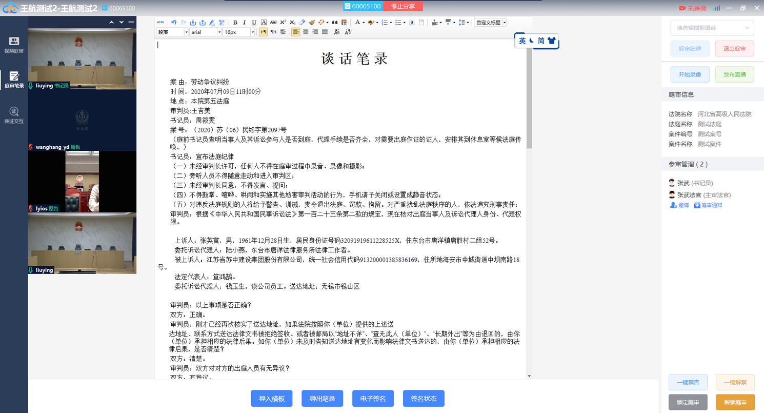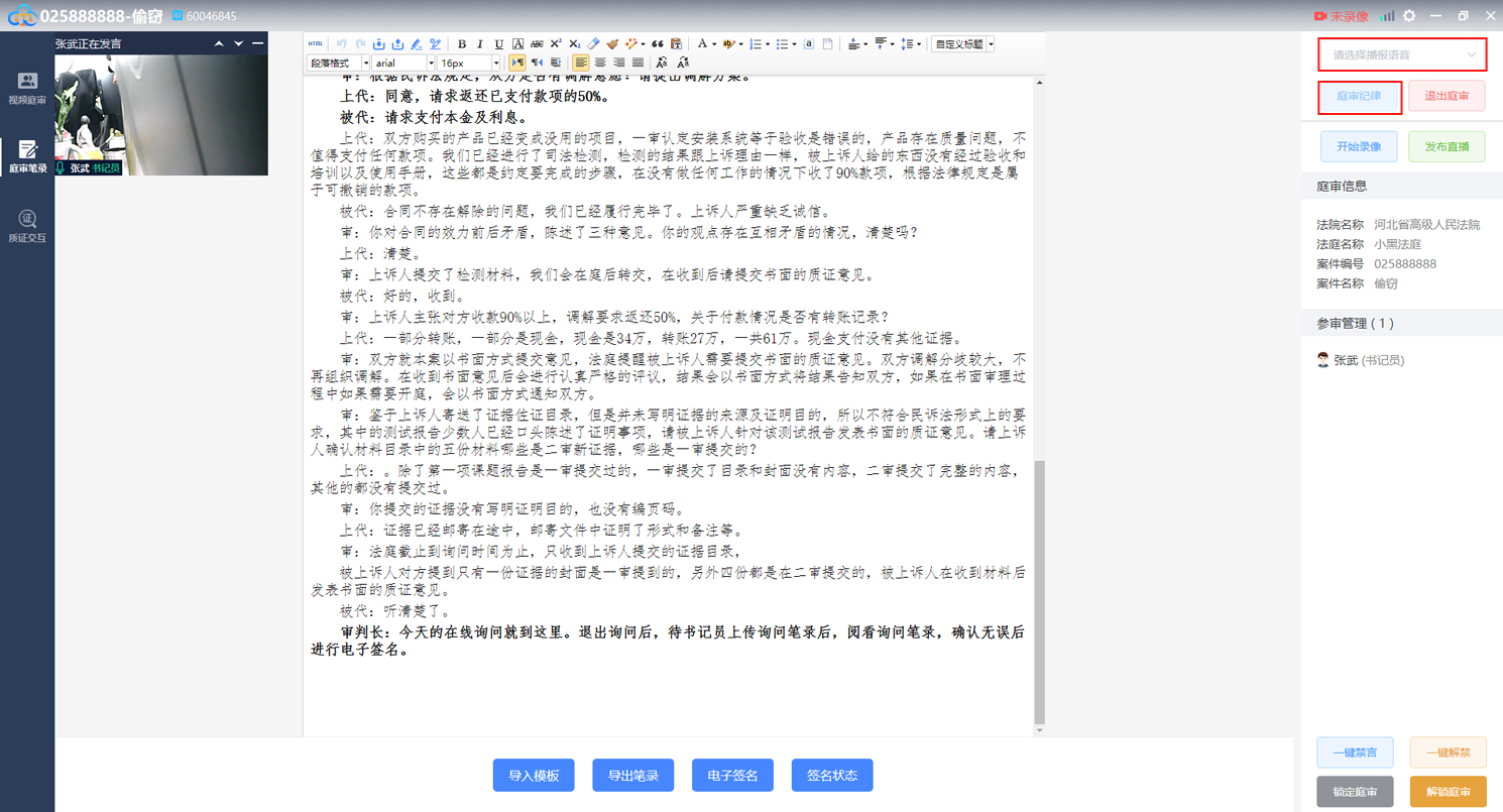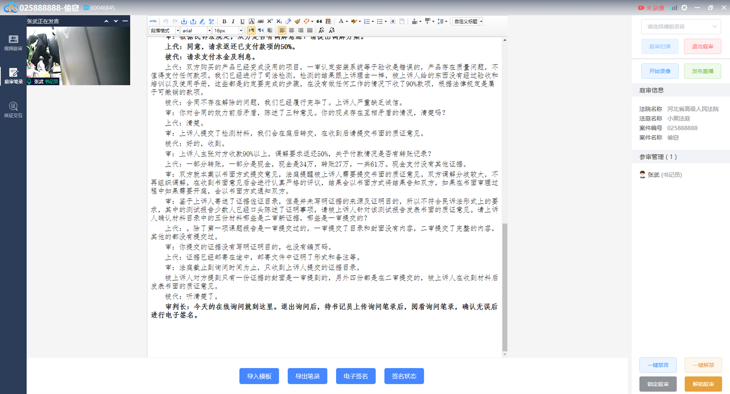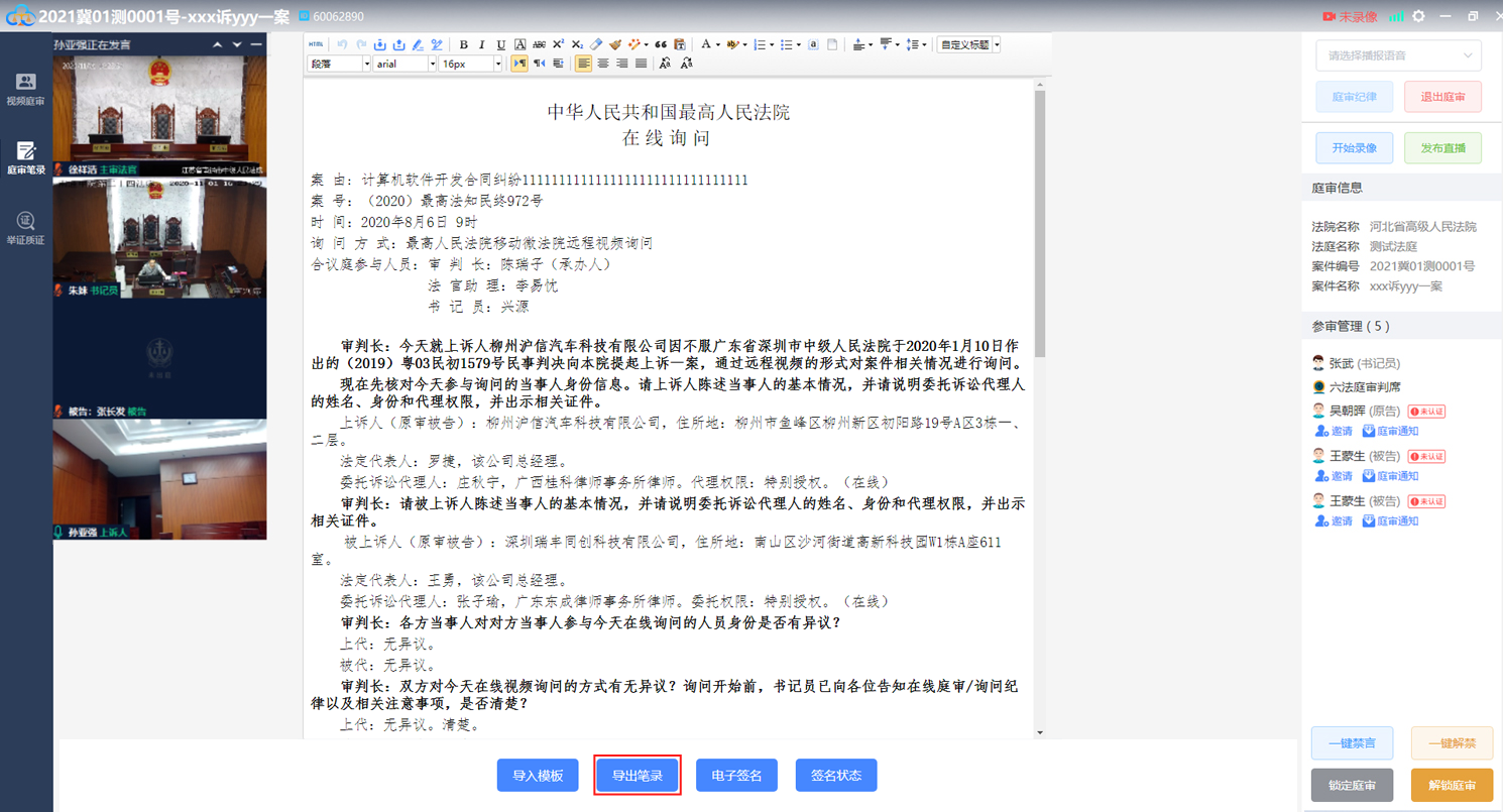 庭审视频页面点击左侧“庭审笔录”按钮即可进入笔录页面,如下图: