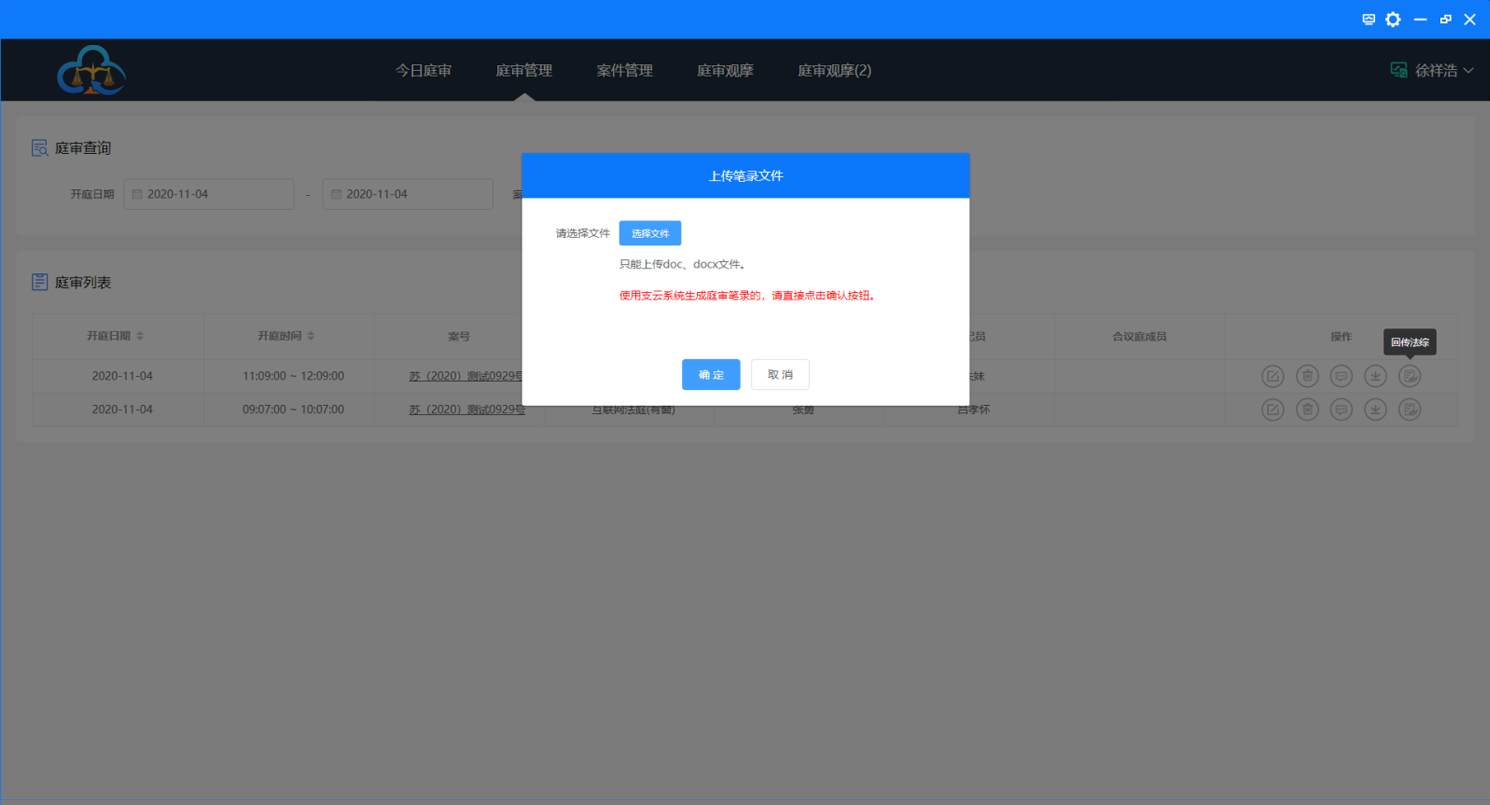 2、使用天翼云法庭庭审录入笔录直接在弹出的窗口中点击“确认”,如果使用科大讯飞单独录入笔录的,请在弹出窗口中点击“选择文件”,选择您的笔录上传,如下图: