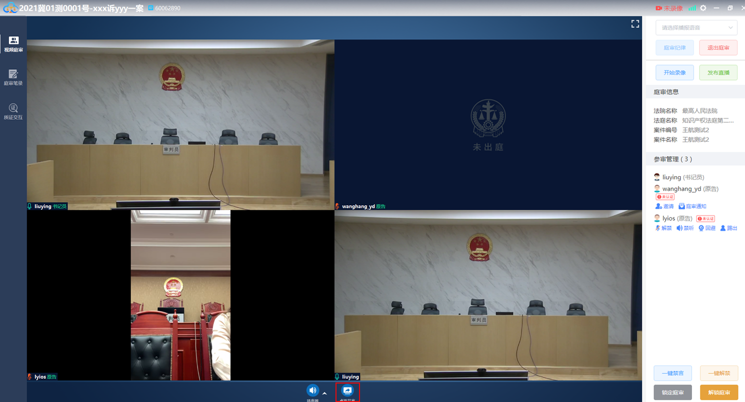 点击“桌面分享”按钮,分享庭审笔录