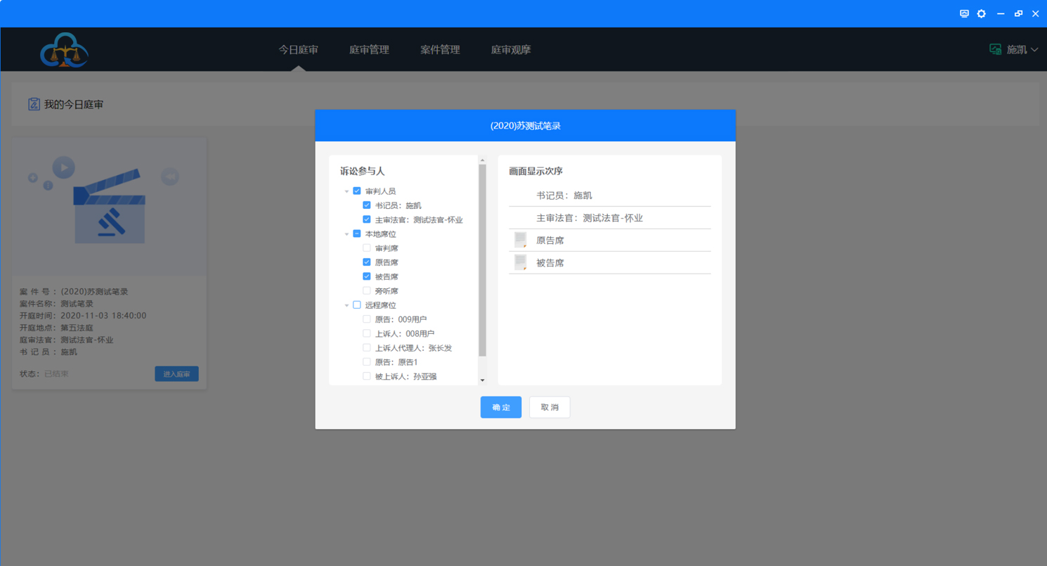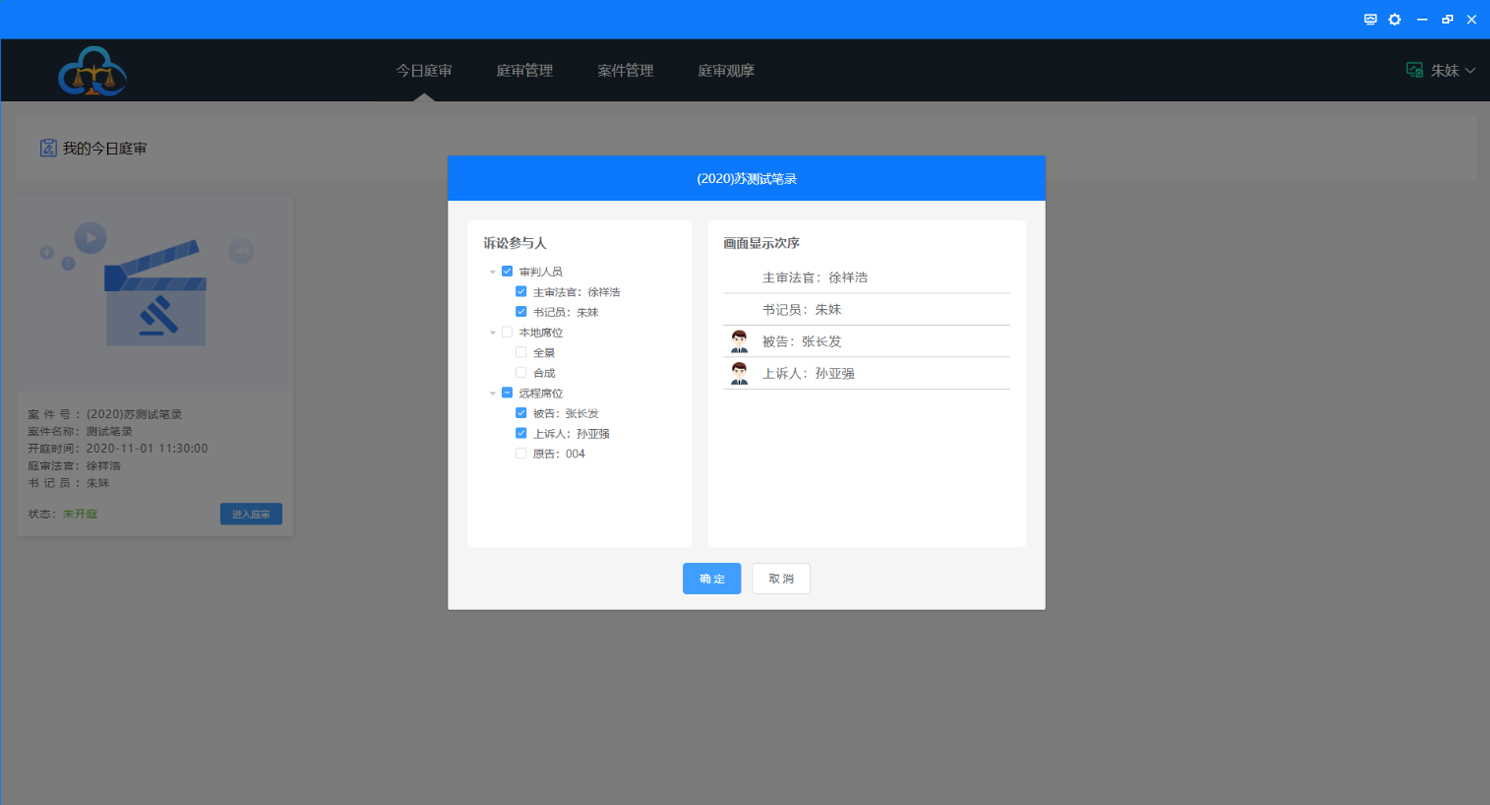 1、勾选该次庭审所有参与方,点击“确认”按钮,如下图: