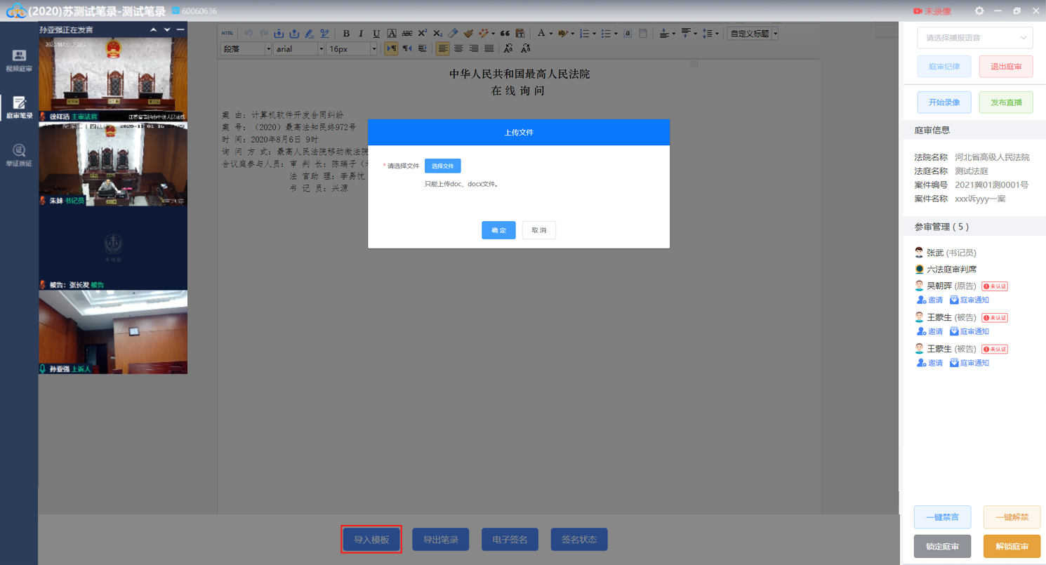 点击“导入模板”按钮,选择需要导入的笔录即可,如下图: