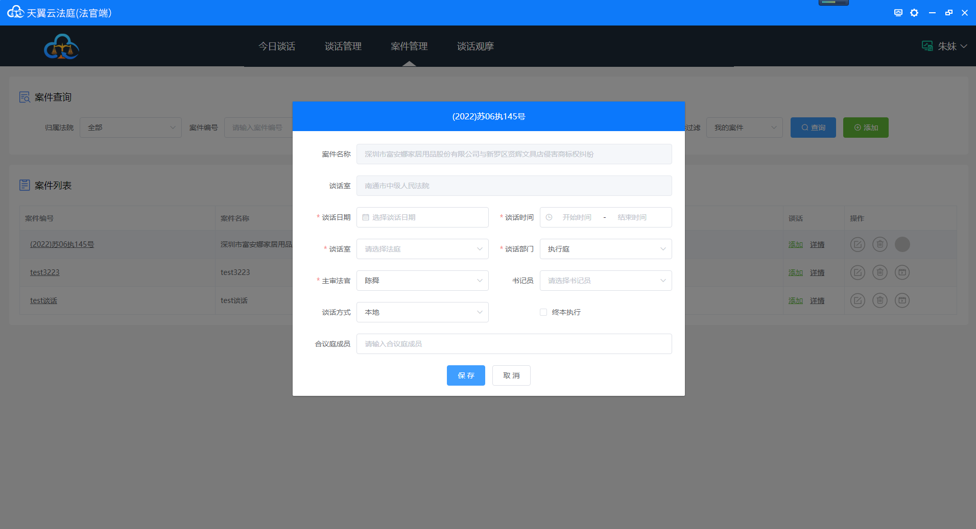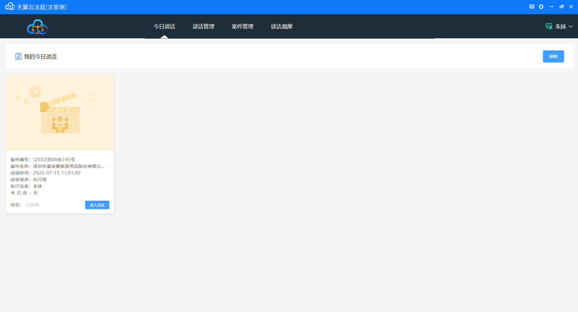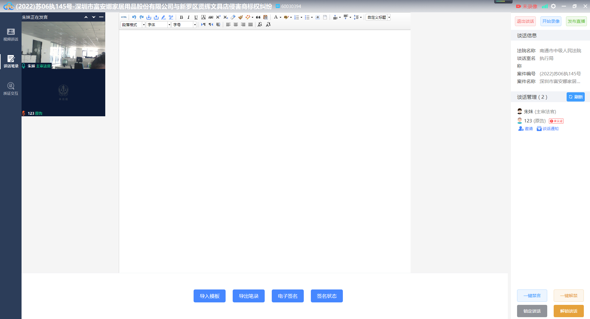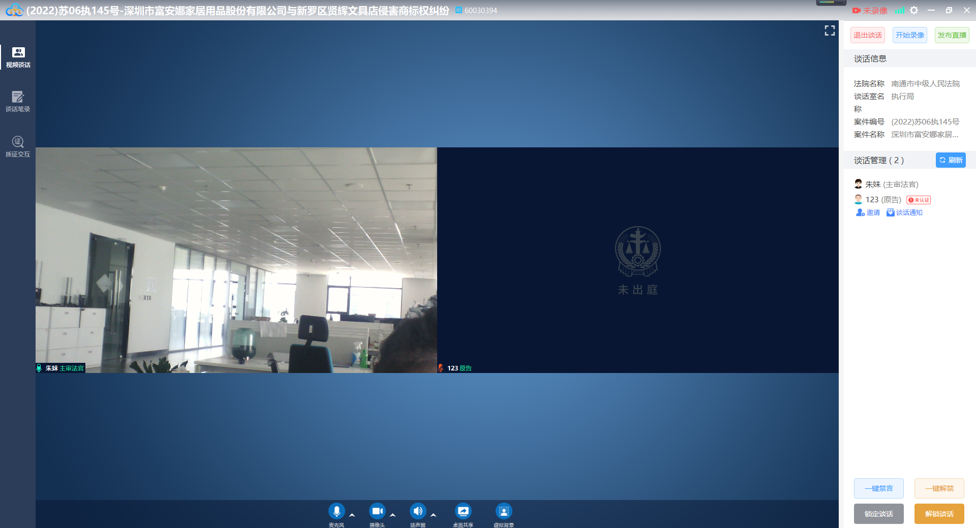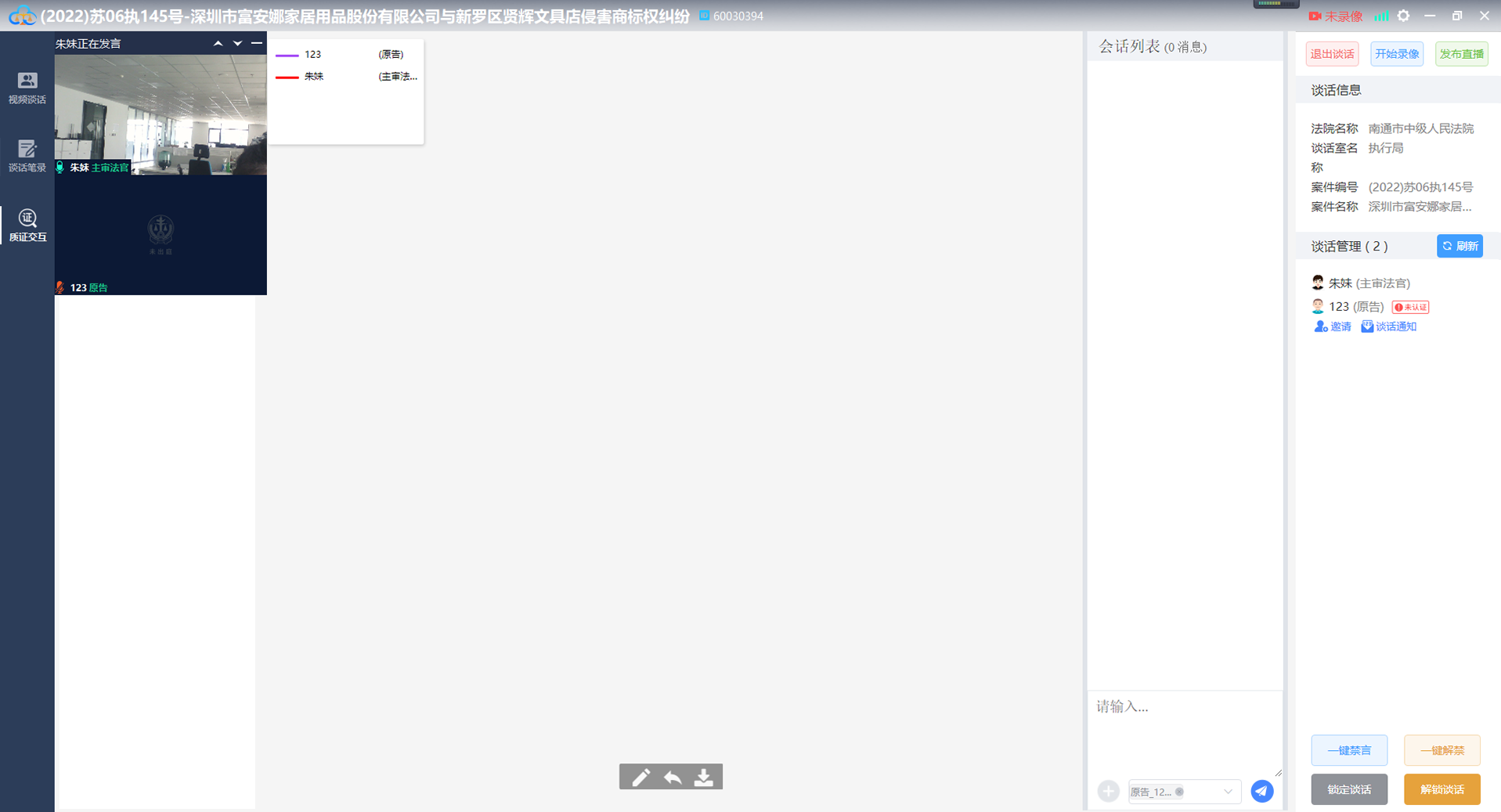 执行谈话操作可由书记员完成,也有由谈话法官完成,若由书记员完成,则法官客户端会自动加入谈话,如下图: